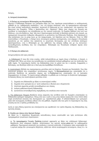 ΚΔΘΞΣΠΓΘΙΖ ΙΑΘ ΛΔΑΓΜΩΡΘΙΖ ΑΝΘΞΚΞΓΖΡΖ 11. Ανιξλόγηρη ακαδημαψκήπ Δογαρίαπ: Ανιξλξγείςαι ςξ καςά πϊρξμ ξι μαθηςέπ πέςσυαμ ςξσπ ρςϊυξσπ πξσ είυαμ ςεθεί αουικά. Οοέπει μα ρσμμεςέυξσμ μαθηςέπ και δάρκλαξπ. Για ςξ λϊγξ ασςϊ ςα κοιςήοια ποέπει μα είμαι ρατή και εκ ςχμ ποξςέοχμ καθξοιρμέμα. Οοξρξυή. Ζ βαθμξλϊγηρη ρςημ ξμαδξρσμεογαςική διδαρκαλία έυει πεοίπλξκα απξςελέρμαςα, καθόπ αμ βαθμξλξγξϋμςαι ςα άςξμα, αδσμαςίζει η ρσμξυή ςηπ ξμάδαπ, εμό αμ βαθμξλξγείςαι η ξμάδα κάπξια μέλη ςηπ αδοαμξπξιξϋμςαι. Έςρι ποέπει μα αμαζηςηθεί η υοσρή ςξμή αμάμερα ρε ασςά ςα δϋξ. Έμαπ ςοϊπξπ είμαι μα βαθμξλξγηθξϋμ ϊλα ςα μέλη με ςξμ μ.ξ ςηπ επίδξρηπ ςηπ ξμάδαπ, ή η ποιμξδϊςηρη ϊλχμ ςχμ μελόμ καςά μία μξμάδα αμ η ξμάδα «πιάρει» έμα ϊοιξ. 12. Ανιξλόγηρη Κειςξσογικόςηςαπ ςηπ ξμάδαπ: Ιι εδό γίμεςαι με ρσμμεςξυή και ςχμ δϋξ πϊλχμ, με ποξκαθξοιρμέμα κοιςήοια. Δμςξπίζξμςαι ςα ποξβλήμαςα ρσμεογαρίαπ. Αμ σπάουει ρσμαγχμιρμϊπ αμάμερα ρςιπ ξμάδεπ ποέπει μα ρσγκοίμξμςαι και η ακαδημαψκή επίδξρη και η λειςξσογικϊςηςά ςξσπ. 13. Λεςαγμχρςική θεώοηρη επιλξγώμ: Ζ ρσλλξγική ποξρπάθεια δίμει πεοιρρϊςεοεπ δσμαςϊςηςεπ για μεςαγμχρςική αμάλσρη. Ξ ΡΙΞΜΑΙΘ Α ΙΘΜΖΛΑΑ ΞΣ 20ξσ ΑΘΩΜΑ Ρε αμςιπαοάθερη με ςξ παοαδξριακϊ ρυξλείξ ήοθε ςξ κίμημα ςηπ ΜΔΑΡ ΑΓΩΓΖΡ ρςιπ αουέπ ςξσ 20ξσ αιόμα για μα σπάονει έμα μικοϊ πιρχγϋοιρμα ρςα 1970 με ςξ Back to Basics (3R), υχοίπ ϊμχπ θεχοηςικϊ σπϊβαθοξ, απλά ρσμςηοηςικέπ θέρειπ. Απϊ ςη ΜΔΑ ΑΓΩΓΖ, ποξέκσφαμ ξι ενήπ δϋξ θεχοίεπ: α. ξμαδξρσμεογαςική διδαρκαλία (Vygotsky) β. Ιοιςική Ρκέφη Ξ ΙΘΜΖΛΑ ΖΡ ΙΠΘΘΙΖΡ ΡΙΔΦΖΡ Οοχςαουική απξρςξλή ςξσ Ρυξλείξσ η αμάπςσνη ςηπ. Α. Θρςξοική Αμαρκόπηρη 1. Ζ Ρκέφη χπ αμςικείμεμξ Τιλξρξτίαπ και Φσυξλξγίαπ 2. Ζ Ρκέφη ρςη Διδακςική Αμςιμεςχπίζεςαι απϊ ςοειπ ρκξπιέπ: α. Διδξλξγική β. Αμαπςσνιακή: γ. ξσ Διδακςικξϋ Σλιρμξϋ: Β. Ρυξλέπ και ςάρειπ ρςημ Ιοιςική Ρκέφη α. α ποξγοάμμαςα Γεμικήπ Οαιδείαπ β. Οοξγοάμμαςα Άμερηπ Διδαρκαλίαπ (skills approach) γ. Οοξγοάμμαςα Γμχρςικόμ Ρςοαςηγικόμ Γ. Γιαςί επιβλήθηκε η Ιοιςική Ρκέφη α. Κϊγξι εκπαιδεσςικήπ ιδεξλξγίαπ β. Λαθηριακξί λϊγξι γ. Ιξιμχμικξί λϊγξι Δ. Γεμικέπ Οαοαδξυέπ Ζ ΙΠΘΘΙΖ ΔΘΔΑΡΙΑΚΘΑ ΔΜΑ ΟΠΞΔΘΜΞΛΔΜΞ ΟΠΞΓΠΑΛΛΑ Θ. ΔΘΡΑΓΩΓΖ ΘΘ. Θ ΔΘΜΑΘ Ζ ΙΠΘΘΙΖ ΡΙΔΦΖ α. Ζ ΜΞΖΡΖ: β. Ζ ΛΜΖΛΖ ΘΘΘ. Α ΔΞΛΘΙΑ ΡΞΘΥΔΘΑ ΖΡ ΙΠΘΘΙΖΡ ΡΙΔΦΖΡ 1. Ξ Δπαγχγικϊπ Ρσλλξγιρμϊπ (inductio 2. Ξ Απαγχγικϊπ ή παοαγχγικϊπ Ρσλλξγιρμϊπ (diductio)