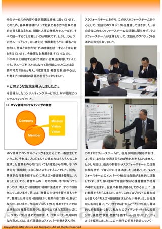 同社では旧来より、グループ全体で共有したい考え方・価値観の浸透を図る取り組みを積極的に行ってきた。創業より55年目を迎え、「100年以上継続する強くて面白い企業」を長期的な会社の目標にし、社会、市場、顧客、そして社員に必要とされる会社作りを行っている。この目標を達成していく上で、グループ全体で共有したい考え方・価値観を組織全体へ浸透させ、より具体的な行動を促すことは必要不可欠なテーマとなっていた。今回導入した施策では、社員の主体性を大前提に、グループ全体で共有したい考え方・価値観の整理を行うことを目的に、「MVV領域」におけるコンサルティングサービスを導入した。