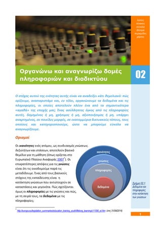 Πώς ορίζουμε, αναπαριστάμε και, εν τέλει, οργανώνουμε τα δεδομένα και τις πληροφορίες, οι οποίες αποτελούν πλέον ένα από τα σημαντικότερα «αγαθά» της εποχής μας; Ένας ασύλληπτος όγκος από τις πληροφορίες αυτές, δομημένος ή μη, χρήσιμος ή μη, αξιοποιήσιμος ή μη, υπάρχει αναρτημένος, σε ποικίλες μορφές, σε εκατομμύρια δικτυακούς τόπους, τους οποίους και κατηγοριοποιούμε, ώστε να μπορούμε εύκολα να αναγνωρίζουμε...
