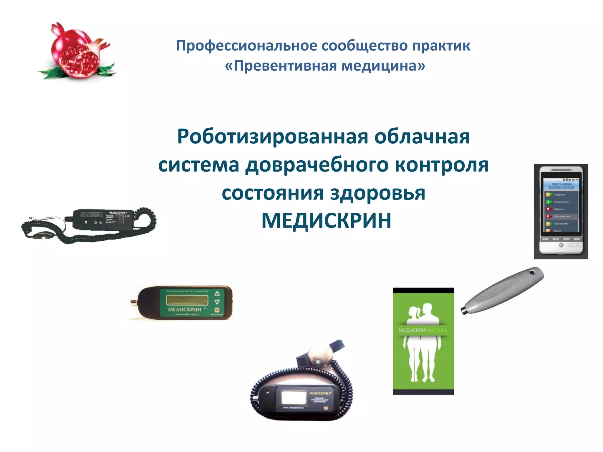 Документ описывает профессиональное сообщество практик 'превентивная медицина' и систему медискрин, представляющую собой автоматизированный комплекс для функциональной диагностики здоровья. Основанная на электродерматографии, система позволяет выявлять заболевания и нарушения в функционировании органов с высокой вероятностью, обеспечивая дистанционный мониторинг здоровья. Основные потребители системы включают медицинские учреждения, страховщиков и семьи, а ее успешная реализация наблюдается в различных регионах России.