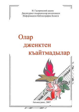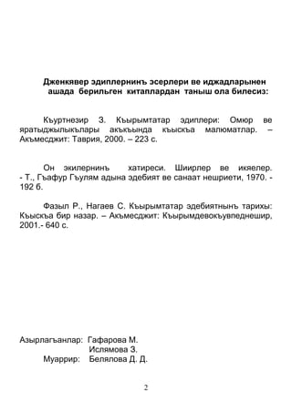 Документ посвящен жизни и творчеству крымскотатарских писателей, участвовавших во Второй мировой войне. Он описывает их наследие, включающее поэзию и литературу, а также подвиги и самопожертвование ради свободы родины. В частности, рассказывается о таких фигурах, как Ыргъат Къадыров и Амди Алим, чье творчество и заслуги оставили заметный след в крымскотатарской литературе.