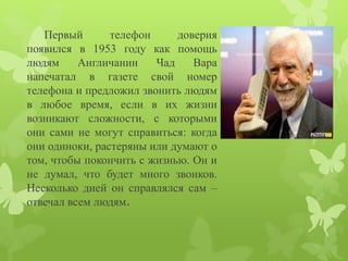 Телефон доверия, созданный в 1953 году, представляет собой глобальное движение, предоставляющее помощь через анонимные телефонные консультации с квалифицированными специалистами. Эта служба помогает людям справляться с эмоциональными трудностями, такими как суицидальные мысли, семейные проблемы и одиночество, и обеспечивает конфиденциальную поддержку. Операторы телефона доверия обладают необходимыми качествами, чтобы выслушать и поддержать обращающихся за помощью в любое время суток.