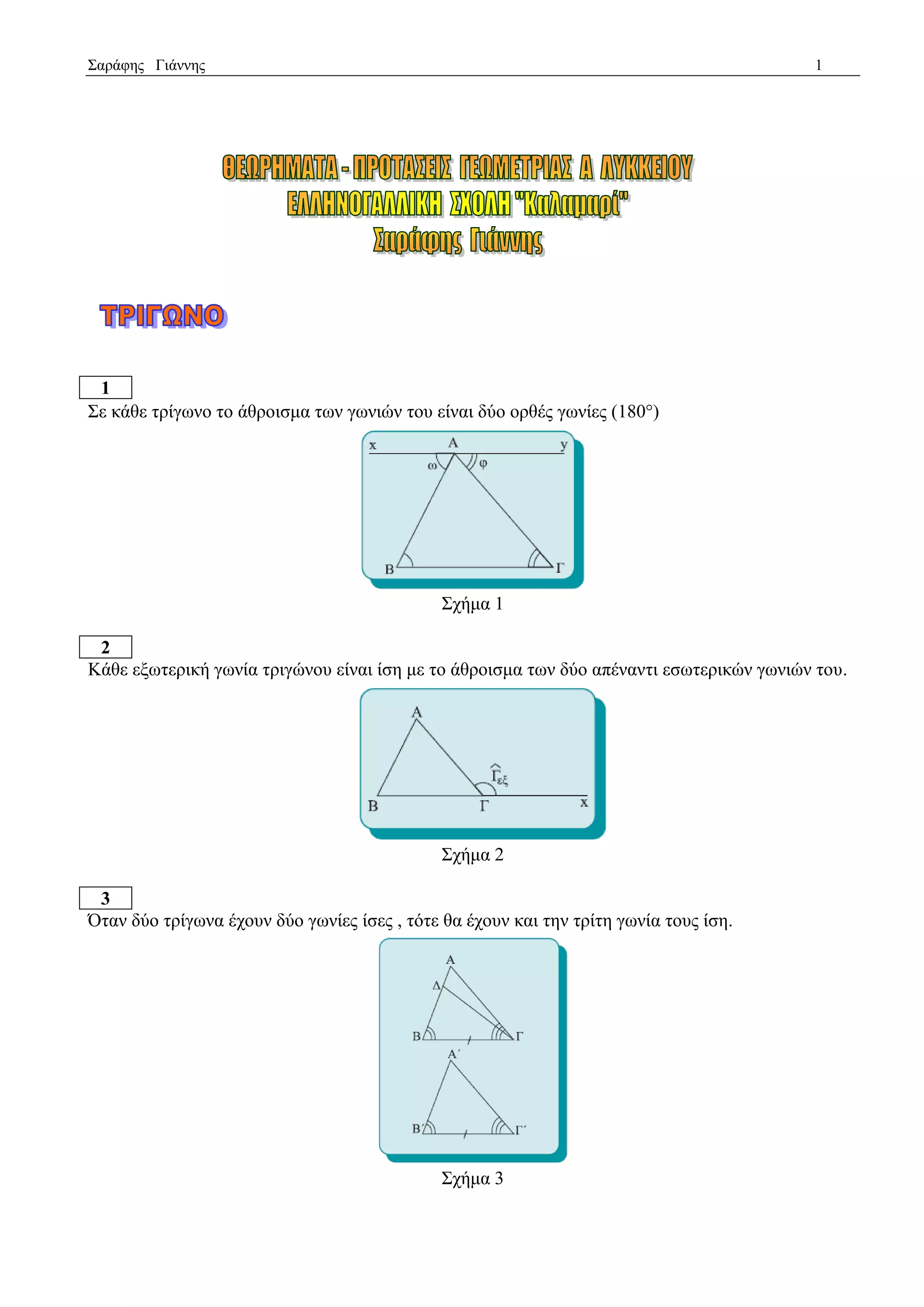 1 Σε θάζε ηξίγσλν ην άζξνηζκα ησλ γσληώλ ηνπ είλαη δύν νξζέο γσλίεο (180) Σρήκα 1 2 Κάζε εμσηεξηθή γσλία ηξηγώλνπ είλαη ίζε κε ην άζξνηζκα ησλ δύν απέλαληη εζσηεξηθώλ γσληώλ ηνπ. Σρήκα 2 3 Όηαλ δύν ηξίγσλα έρνπλ δύν γσλίεο ίζεο , ηόηε ζα έρνπλ θαη ηελ ηξίηε γσλία ηνπο ίζε. Σρήκα 3