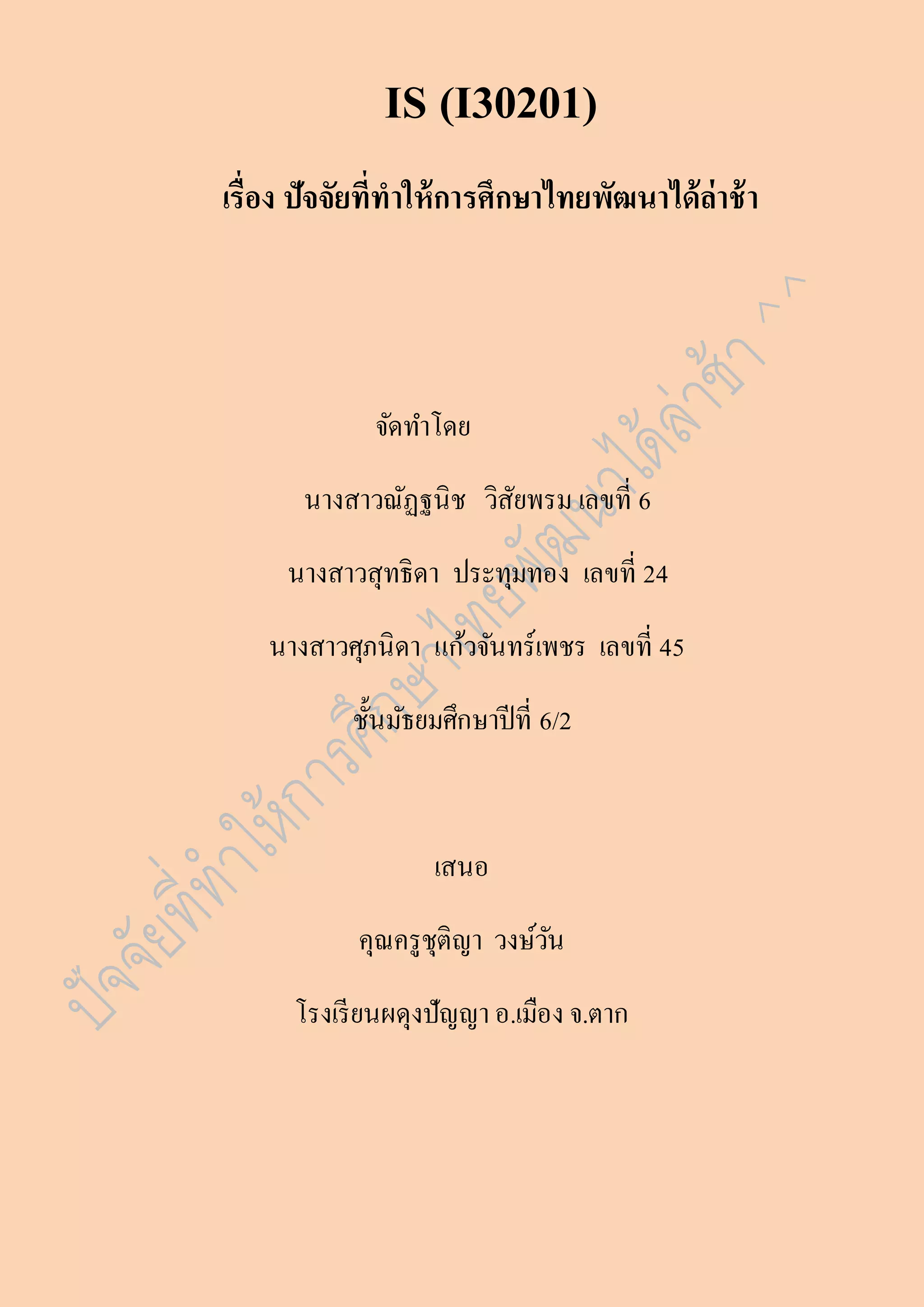 ปัจจัยที่ทำให้กำรศึกษำไทยพัฒนำได้ล่ำช้ำ จัดทำ โดย นำงสำวณัฏฐนิช วิสัยพรม เลขที่ 6 นำงสำวสุทธิดำ ประทุมทอง เลขที่ 24 นำงสำวศุภนิดำ แก้วจันทร์เพชร เลขที่ 45 ชั้นมัธยมศึกษำปีที่ 6/2 เสนอ คุณครูชุติญำ วงษ์วัน โรงเรียนผดุงปัญญำ อ.เมือง จ.ตำก