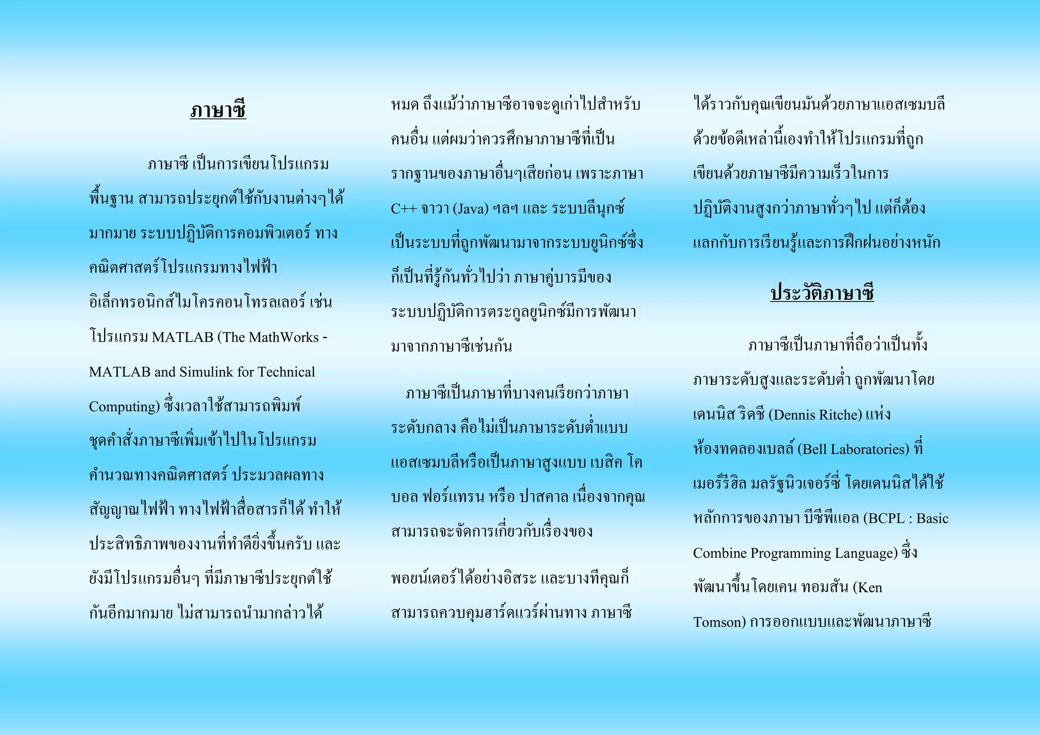 พื้นฐาน สามารถประยุกต์ใช้กับงานต่างๆได้ มากมาย ระบบปฏิบัติการคอมพิวเตอร์ ทาง คณิตศาสตร์โปรแกรมทางไฟฟ้า อิเล็กทรอนิกส์ไมโครคอนโทรลเลอร์ เช่น โปรแกรม MATLAB (The MathWorks - MATLAB and Simulink for Technical Computing) ซึ่งเวลาใช้สามารถพิมพ์ ชุดคาสั่งภาษาซีเพิ่มเข้าไปในโปรแกรม คานวณทางคณิตศาสตร์ ประมวลผลทาง สัญญาณไฟฟ้า ทางไฟฟ้าสื่อสารก็ได้ ทาให้ ประสิทธิภาพของงานที่ทาดียิ่งขึ้นครับ และ ยังมีโปรแกรมอื่นๆ ที่มีภาษาซีประยุกต์ใช้ กันอีกมากมาย ไม่สามารถนามากล่าวได้ หมด ถึงแม้ว่าภาษาซีอาจจะดูเก่าไปสาหรับ คนอื่น แต่ผมว่าควรศึกษาภาษาซีที่เป็น รากฐานของภาษาอื่นๆเสียก่อน เพราะภาษา C++ จาวา (Java) ฯลฯ และ ระบบลีนุกซ์ เป็นระบบที่ถูกพัฒนามาจากระบบยูนิกซ์ซึ่ง ก็เป็นที่รู้กันทั่วไปว่า ภาษาคู่บารมีของ ระบบปฏิบัติการตระกูลยูนิกซ์มีการพัฒนา มาจากภาษาซีเช่นกัน ภาษาซีเป็นภาษาที่บางคนเรียกว่าภาษา ระดับกลาง คือไม่เป็นภาษาระดับต่าแบบ แอสเซมบลีหรือเป็นภาษาสูงแบบ เบสิค โค บอล ฟอร์แทรน หรือ ปาสคาล เนื่องจากคุณ สามารถจะจัดการเกี่ยวกับเรื่องของ พอยน์เตอร์ได้อย่างอิสระ และบางทีคุณก็ สามารถควบคุมฮาร์ดแวร์ผ่านทาง ภาษาซี ได้ราวกับคุณเขียนมันด้วยภาษาแอสเซมบลี ด้วยข้อดีเหล่านี้เองทาให้โปรแกรมที่ถูก เขียนด้วยภาษาซีมีความเร็วในการ ปฏิบัติงานสูงกว่าภาษาทั่วๆไป แต่ก็ต้อง แลกกับการเรียนรู้และการฝึกฝนอย่างหนัก ประวัติภาษาซี ภาษาซีเป็นภาษาที่ถือว่าเป็นทั้ง ภาษาระดับสูงและระดับต่า ถูกพัฒนาโดย เดนนิส ริดชี (Dennis Ritche) แห่ง ห้องทดลองเบลล์ (Bell Laboratories) ที่ เมอร์รีฮิล มลรัฐนิวเจอร์ซี่ โดยเดนนิสได้ใช้ หลักการของภาษา บีซีพีแอล (BCPL : Basic Combine Programming Language) ซึ่ง พัฒนาขึ้นโดยเคน ทอมสัน (Ken Tomson) การออกแบบและพัฒนาภาษาซี