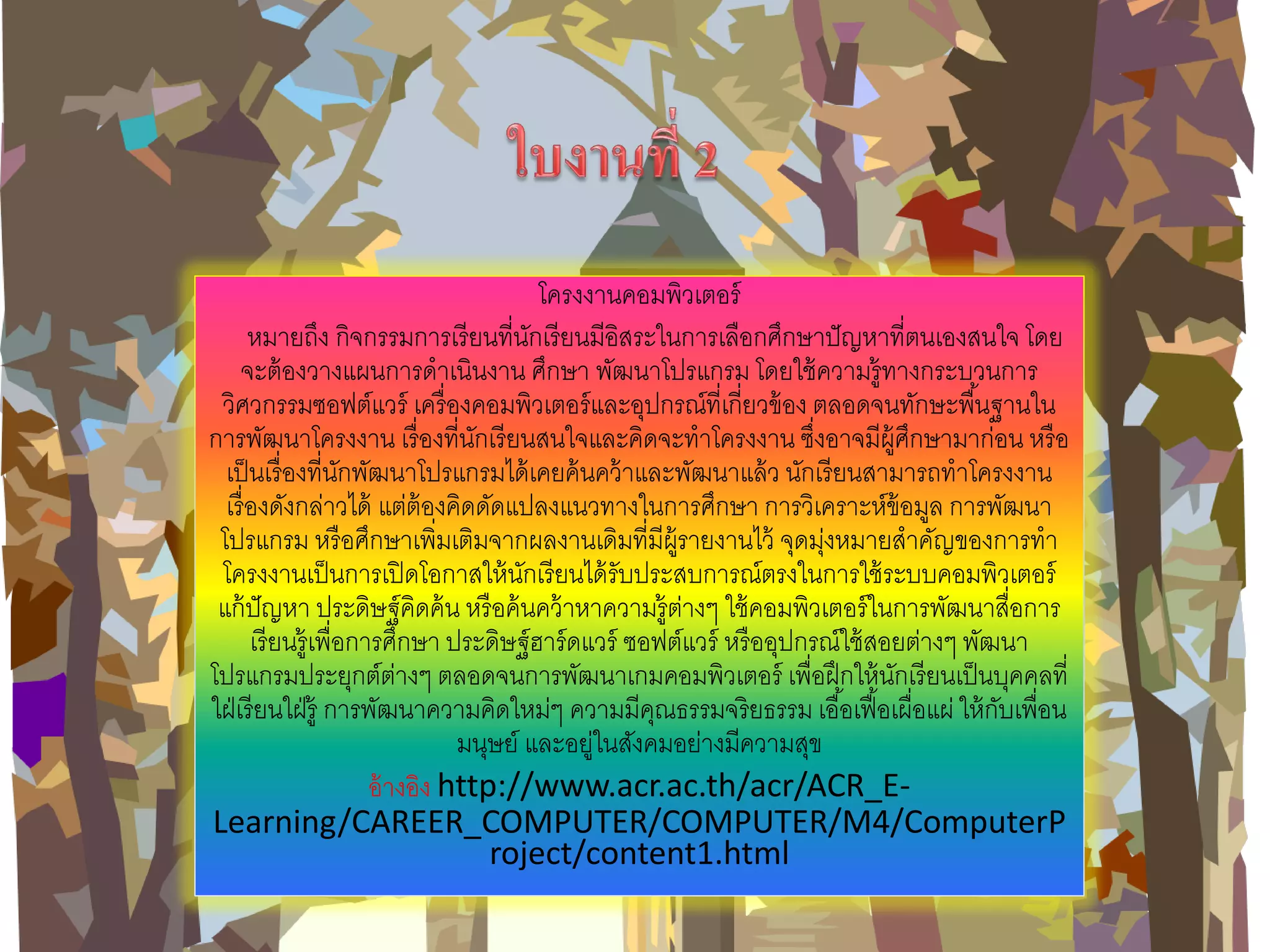 โดย จะต้องวางแผนการดาเนินงาน ศึกษา พัฒนาโปรแกรม โดยใช้ความรู้ทางกระบวนการ วิศวกรรมซอฟต์แวร์ เครื่องคอมพิวเตอร์และอุปกรณ์ที่เกี่ยวข้อง ตลอดจนทักษะพื้นฐานใน การพัฒนาโครงงาน เรื่องที่นักเรียนสนใจและคิดจะทาโครงงาน ซึ่งอาจมีผู้ศึกษามาก่อน หรือ เป็นเรื่องที่นักพัฒนาโปรแกรมได้เคยค้นคว้าและพัฒนาแล้ว นักเรียนสามารถทาโครงงาน เรื่องดังกล่าวได้ แต่ต้องคิดดัดแปลงแนวทางในการศึกษา การวิเคราะห์ข้อมูล การพัฒนา โปรแกรม หรือศึกษาเพิ่มเติมจากผลงานเดิมที่มีผู้รายงานไว้ จุดมุ่งหมายสาคัญของการทา โครงงานเป็นการเปิดโอกาสให้นักเรียนได้รับประสบการณ์ตรงในการใช้ระบบคอมพิวเตอร์ แก้ปัญหา ประดิษฐ์คิดค้น หรือค้นคว้าหาความรู้ต่างๆ ใช้คอมพิวเตอร์ในการพัฒนาสื่อการ เรียนรู้เพื่อการศึกษา ประดิษฐ์ฮาร์ดแวร์ ซอฟต์แวร์ หรืออุปกรณ์ใช้สอยต่างๆ พัฒนา โปรแกรมประยุกต์ต่างๆ ตลอดจนการพัฒนาเกมคอมพิวเตอร์ เพื่อฝึกให้นักเรียนเป็นบุคคลที่ ใฝ่เรียนใฝ่รู้ การพัฒนาความคิดใหม่ๆ ความมีคุณธรรมจริยธรรม เอื้อเฟื้อเผื่อแผ่ ให้กับเพื่อน มนุษย์ และอยู่ในสังคมอย่างมีความสุข อ้างอิง http://www.acr.ac.th/acr/ACR_E- Learning/CAREER_COMPUTER/COMPUTER/M4/ComputerProject/content1.html