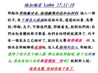 文档讲述了耶稣治愈十个麻风病人,其中只有一位撒玛利亚人回去感谢耶稣,强调感恩的重要性。故事反映了信心与感恩之间的关系,以及人们往往对神迹习以为常而缺乏感激的现实。耶稣提醒我们,得救不仅是身体的医治,更是灵魂的拯救,真正的信仰应伴随感恩的心。