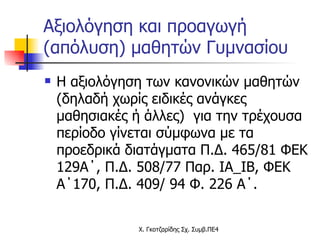 Αξιολόγηση και προαγωγή(απόλυση) μαθητών Γυμνασίου Η αξιολόγηση των κανονικών μαθητών (δηλαδή χωρίς ειδικές ανάγκες μαθησιακές ή άλλες) για την τρέχουσα περίοδο γίνεται σύμφωνα με τα προεδρικά διατάγματα Π.Δ. 465/81 ΦΕΚ 129Α΄, Π.Δ. 508/77 Παρ. ΙΑ_ΙΒ, ΦΕΚ Α΄170, Π.Δ. 409/ 94 Φ. 226 Α΄.