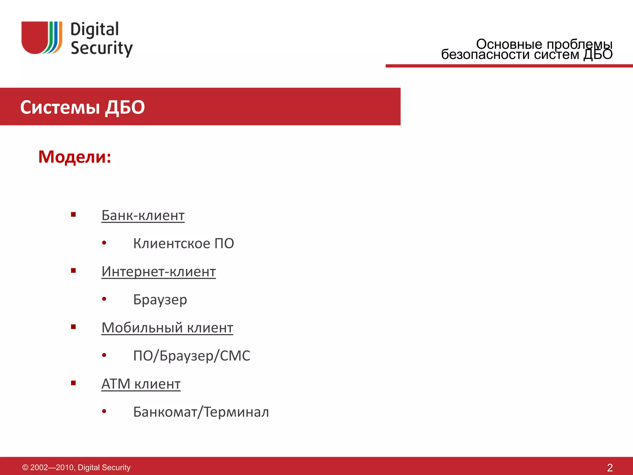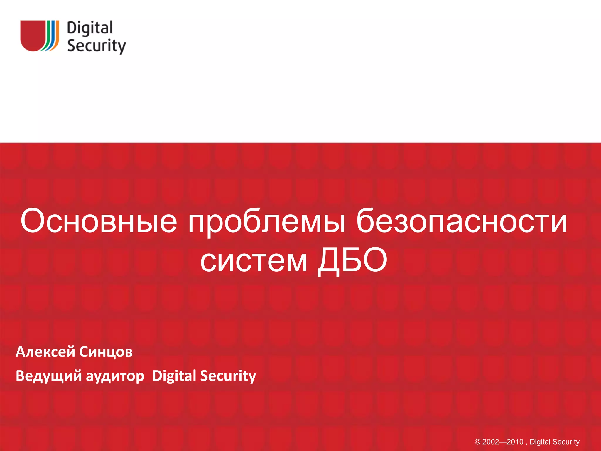 Документ рассматривает основные проблемы безопасности систем дистанционного банковского обслуживания (ДБО), фокусируясь на уязвимостях клиентской и серверной частей. Учитываются угрозы от злоумышленников, а также популярные ошибки, такие как SQL-инъекции и межсайтовый скриптинг. В заключение подчеркивается необходимость комплексной защиты и тестирования защищенности для предотвращения атак на системы ДБО.