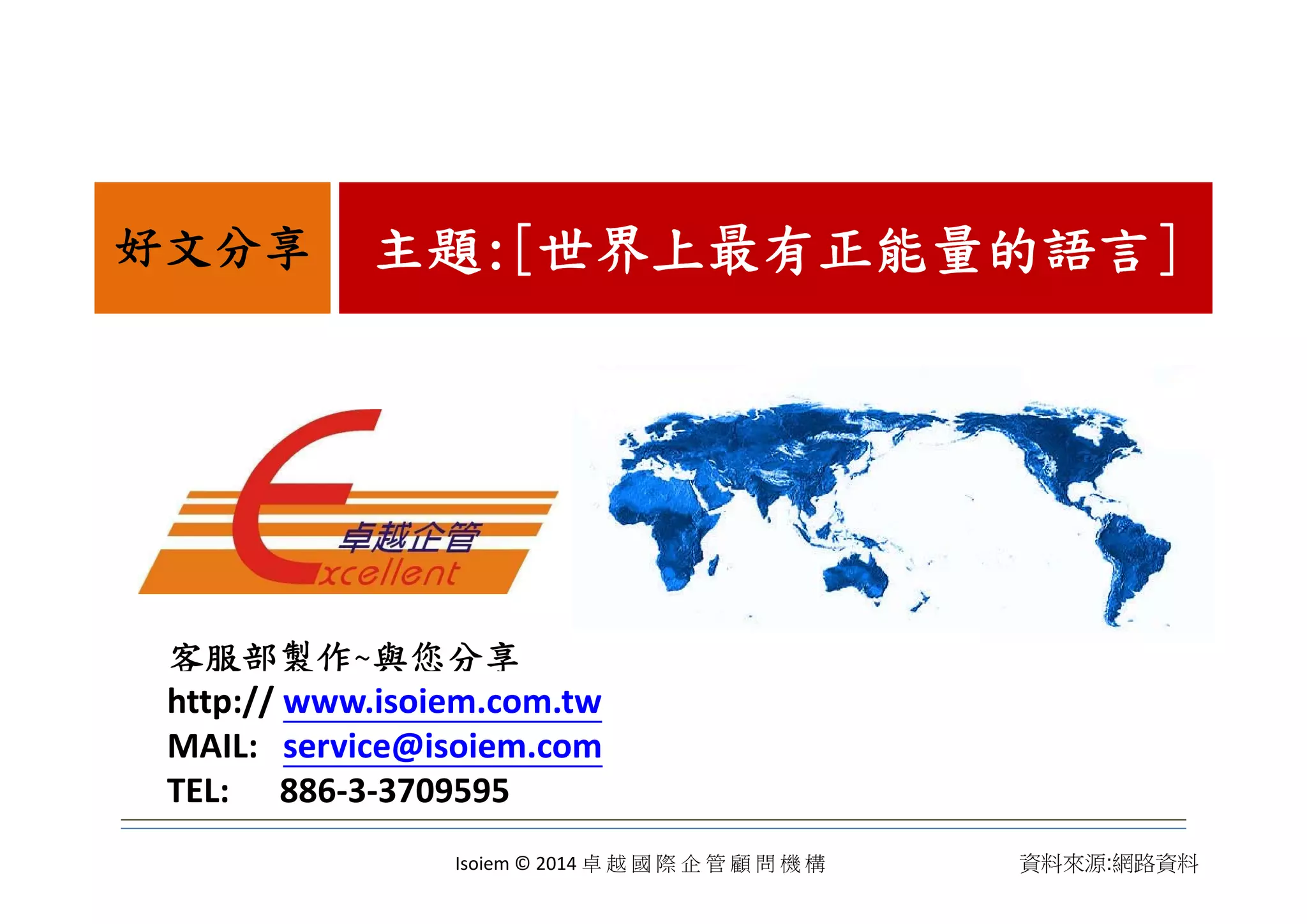 主題主題:[:[世界上最有正能量的語言世界上最有正能量的語言]]好文分享 主題主題:[:[世界上最有正能量的語言世界上最有正能量的語言]]好文分享 客服部製作~與您分享 http:// www.isoiem.com.tw MAIL: service@isoiem.com TEL: 886‐3‐3709595 Isoiem