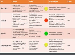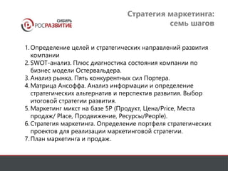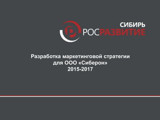 Документ описывает маркетинговую стратегию для ООО 'Сиберон' на 2015-2017 годы, основанную на семи ключевых шагах, включая определение целей, SWOT-анализ, анализ рынка и выбор стратегии развития. Также рассматриваются элементы маркетинг-микса, такие как продукт, цена, места продаж и продвижение, а также план маркетинга и продаж с указанием мероприятий и бюджета. Включены показатели эффективности и контроль выполнения плана для достижения рыночных целей.