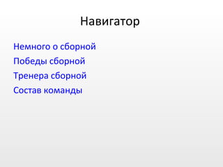 Документ представляет собой обзор национальной сборной России по футболу, основанной в 1992 году, и описывает ее достижения, тренеров и состав команды. Наивысшим достижением стало третье место на чемпионате Европы 2008 года под руководством Гуса Хиддинка. В документе перечислены ключевые игроки текущего состава и их достижения в различных турнирах.