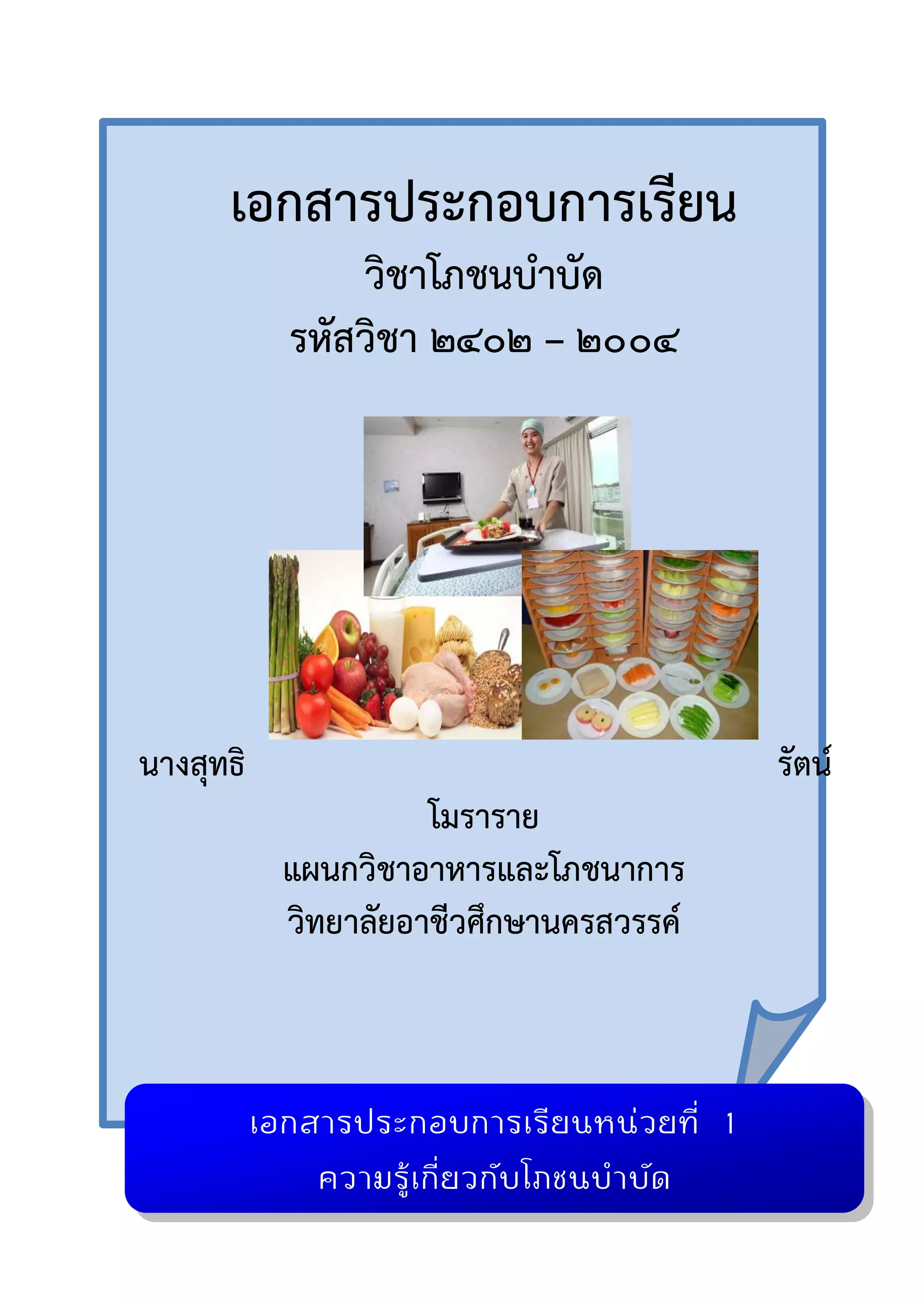 2402 – 2004 นางสุทธิรัตน์ โมราราย แผนกวิชาอาหารและโภชนาการ วิทยาลัยอาชีวศึกษานครสวรรค์ เอกสารประกอบการเรียนหน่วยที่ 1 ความรู้เกี่ยวกับโภชนบาบัด