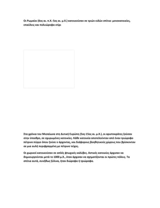 Oι Ρωμαίοι (6οςαι. π.Χ.-5ος αι. μ.Χ.) κατοικούσαν σε τριών ειδών σπίτια: μονοκατοικίες,