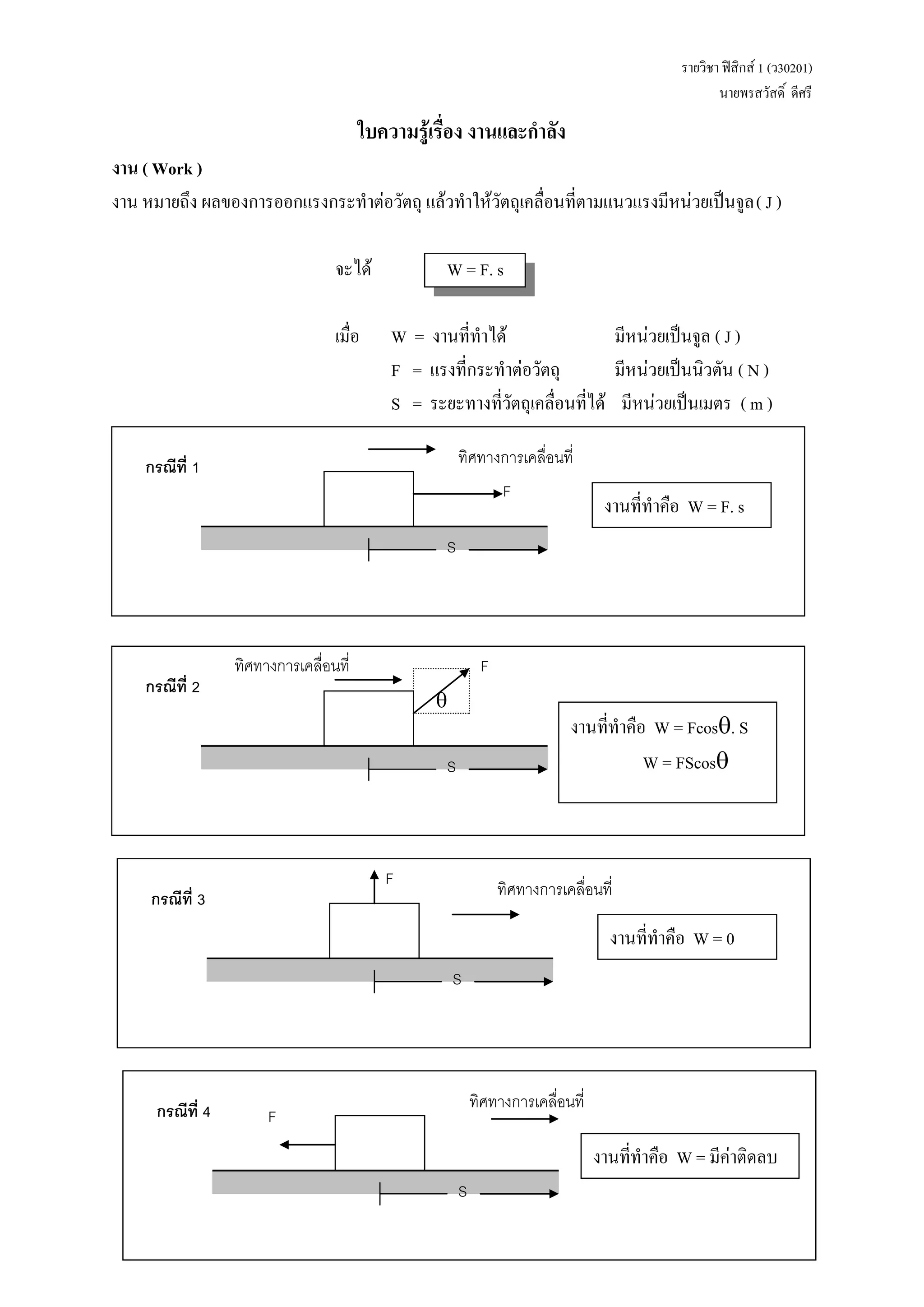 เนื่องจากงาน เป็นผลของแรงที่กระทาต่อวัตถุแล้วทาให้วัตถุเคลื่อนที่ตามแนวแรง
