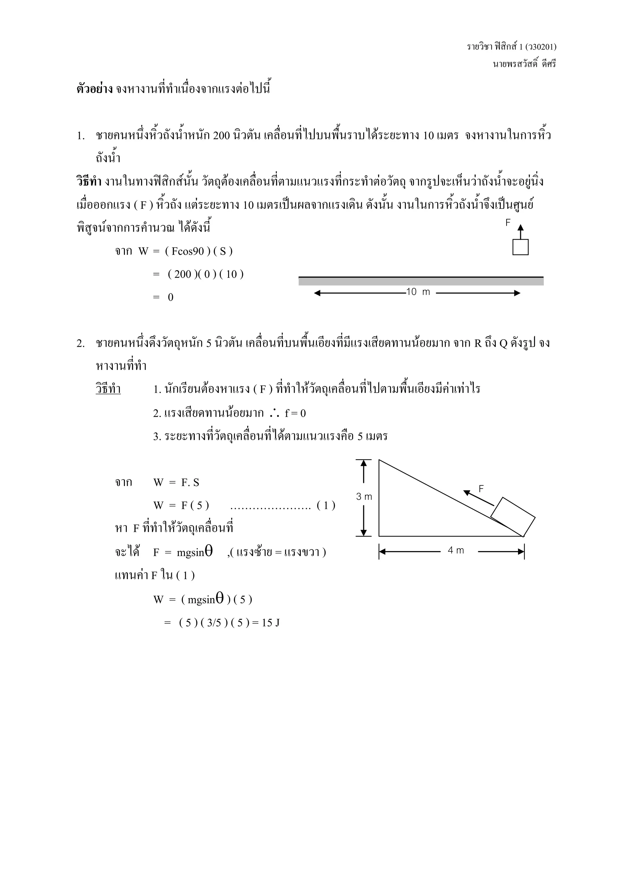 1. ชายคนหนึ่งหิ้วถังน้าหนัก 200 นิวตัน เคลื่อนที่ไปบนพื้นราบได้ระยะทาง 10 เมตร จงหางานในการหิ้ว ถังน้า