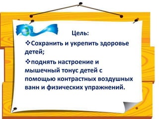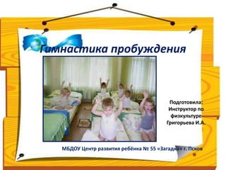 Документ описывает программу гимнастики пробуждения для детей, разработанную инструктором по физкультуре. Основная цель программы заключается в укреплении здоровья и поднятии настроения детей через различные физические упражнения и закаливание. Включает оздоровительные, образовательные и воспитательные задачи, а также рекомендации по организации и проведению занятий.