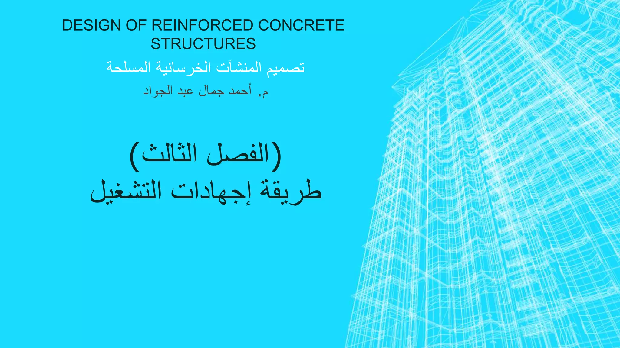 يتناول الفصل الثالث من كتاب تصميم المنشآت الخرسانية المسلحة لم. أحمد جمال عبد الجواد طريقة إجهادات التشغيل، حيث يستعرض فرضيات التصميم المختلفة ومحاور العمل الأساسية بما في ذلك الإجهادات المسموح بها، التحليل، وتصميم المقاطع الخرسانية. كما يتناول طرق التصميم المختلفة والأمثلة التطبيقية لتطبيق هذه المبادئ في مشاريع الهندسة المدنية.