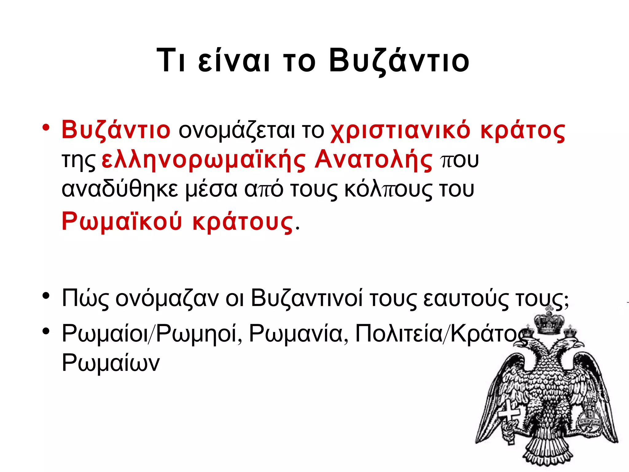 • Βυζάντιο ονομάζεται το χριστιανικό κράτος