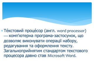 текстовий процесор, його призначення 1. 2. Те́кстовий проце́сор (англ. word processor)