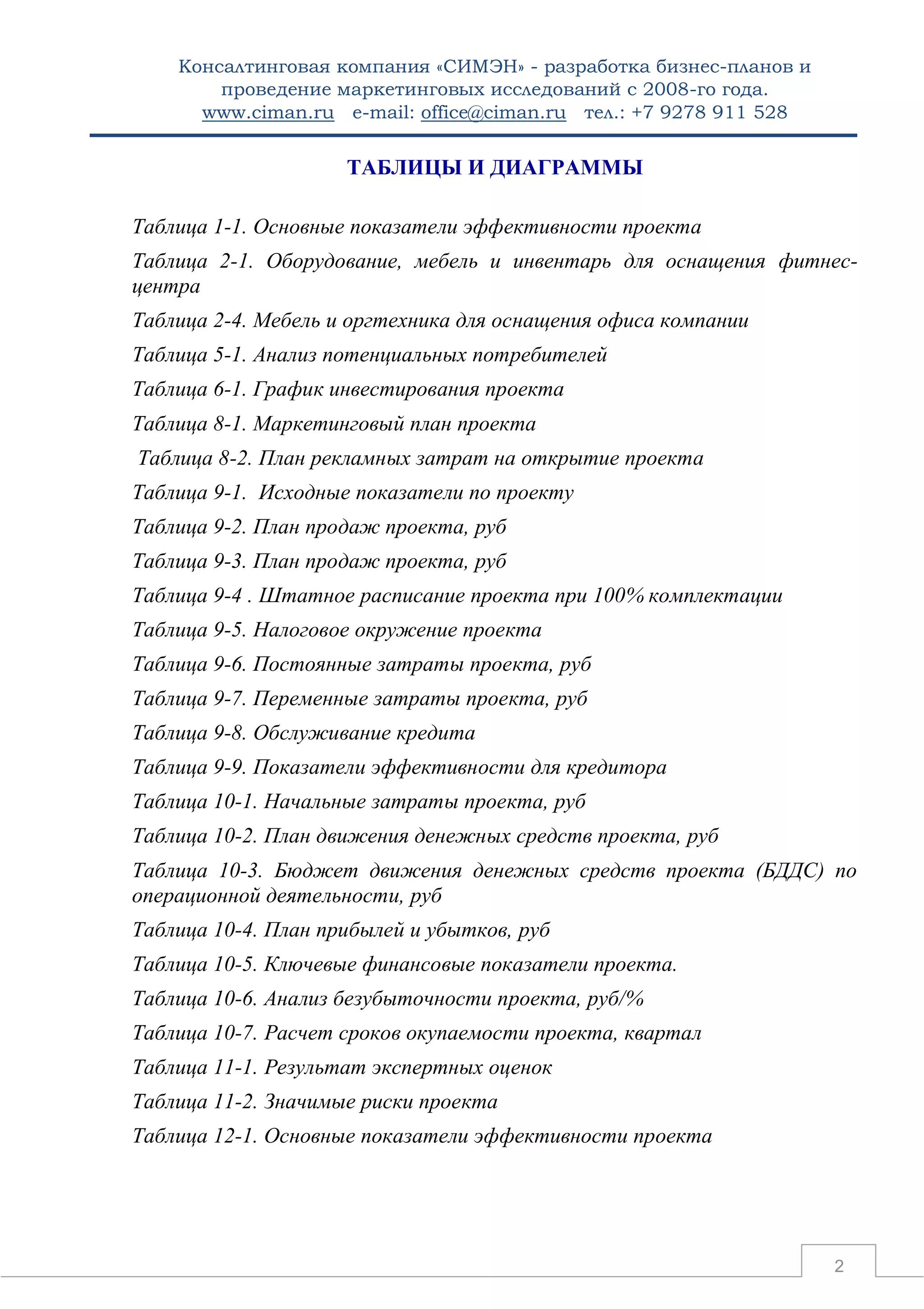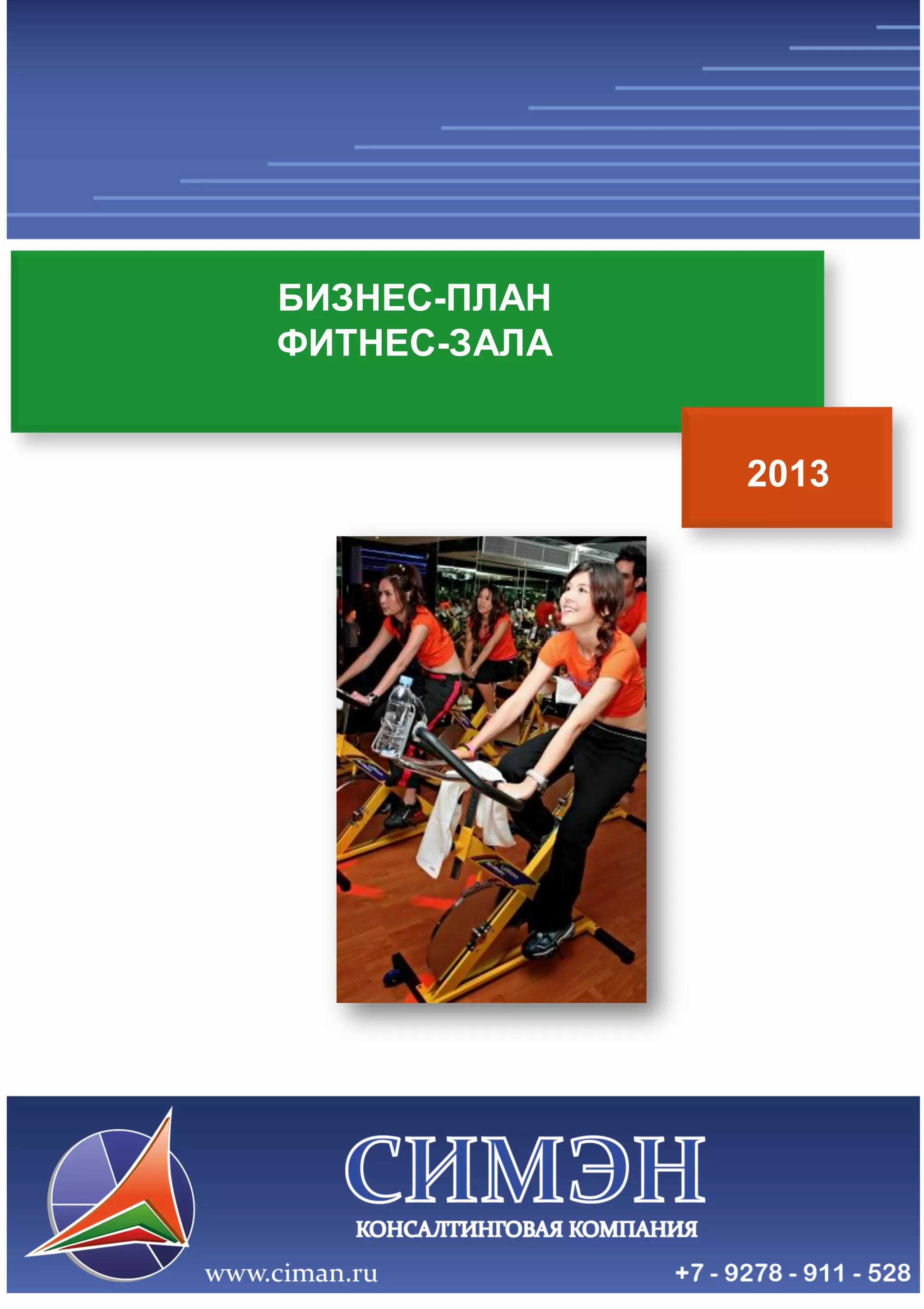 Документ представляет собой бизнес-план для фитнес-зала, охватывающий ключевые аспекты инвестиционных мероприятий, экономическую эффективность и маркетинговый анализ. Он включает данные о планировании затрат, целевой аудитории, конкурентной среде и ожидаемых доходах за 5-летний период. Консалтинговая компания «Симен» занимается разработкой бизнес-планов и маркетинговыми исследованиями с 2008 года.