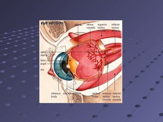 Документ описывает анатомию органов чувств, в частности, глаз и ушей, включая их строение и функции. Объясняется, как глазовые структуры, такие как роговица и сетчатка, участвуют в восприятии света, а также как звуковые волны обрабатываются ухом для восприятия звука. Приведены детальные характеристики частей глазного и слухового аппаратов и их жизненно важные роли в восприятии окружающего мира.