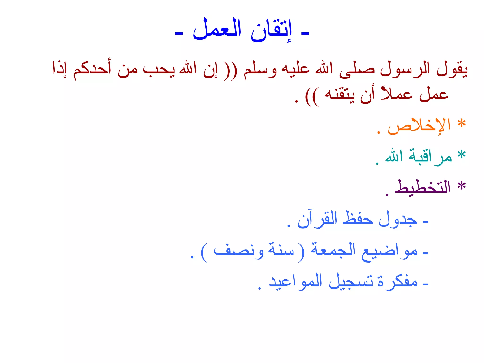تتناول الوثيقة أهمية إتقان العمل والالتزام بمعايير الأداء العالية، بالإضافة إلى استراتيجيات لتحقيق النجاح الشخصي والمهني من خلال تنظيم الوقت وتحديد الأهداف. كما تتضمن مواضيع مثل حفظ القرآن وتخطيط المواعيد وتنمية المهارات الإنسانية. الوثيقة تحتوي على مبادئ السعي للتميز والنجاح والعيش بوعي اجتماعي.