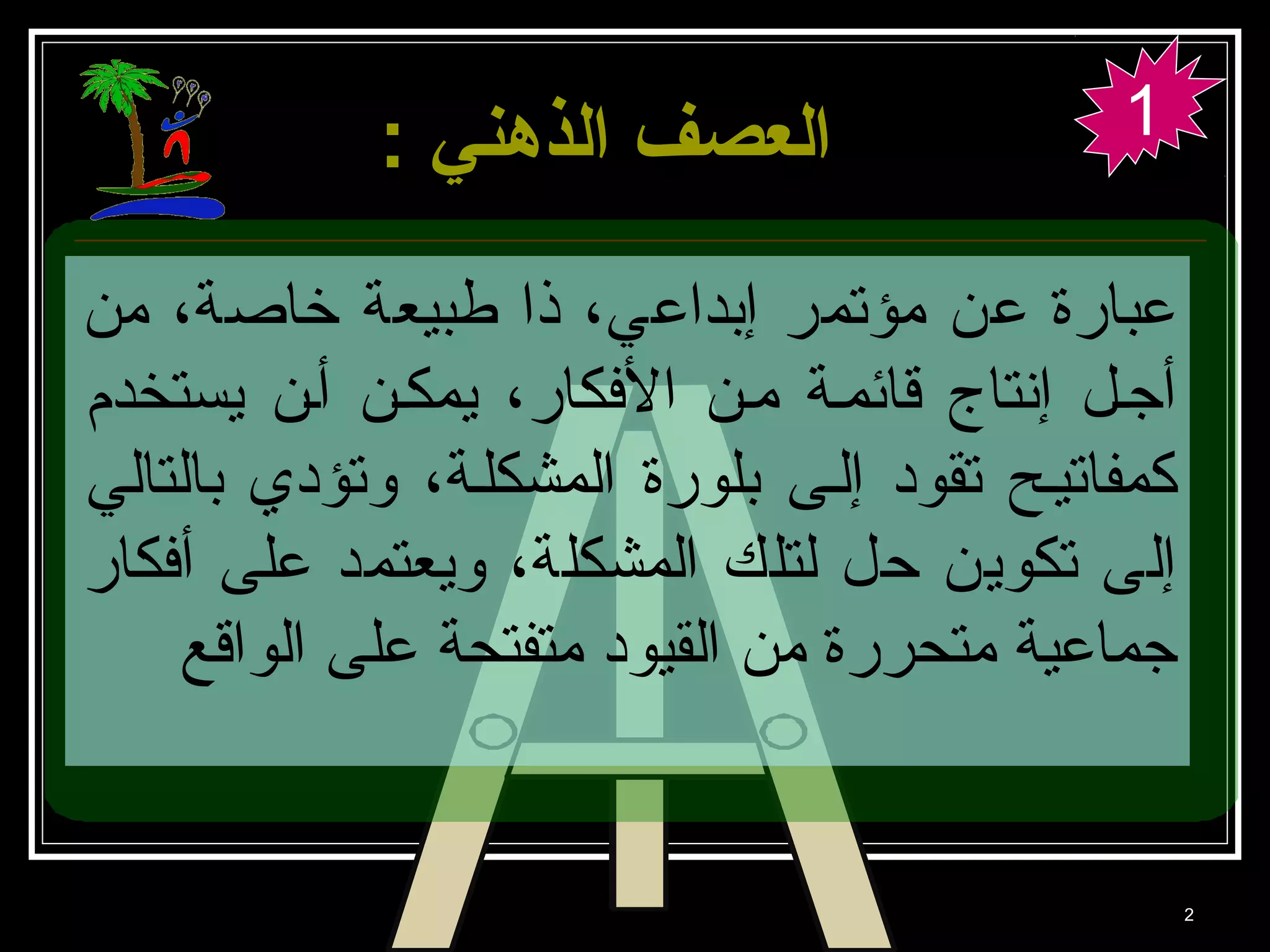 تتناول الوثيقة مفهوم العصف الذهني كطريقة لإنتاج أفكار جديدة لحل المشكلات، حيث تهدف إلى تحفيز الإبداع الجماعي وتبادل الأفكار بحرية. تشمل أهداف العصف الذهني توليد حلول مبتكرة، تعزيز الاحترام بين المشاركين، وإزالة الحواجز النفسية. كما تتناول بعض الاستراتيجيات مثل الاستبدال، الجمع، التكيف، والتعديل لتطوير الأفكار وتحسينها.