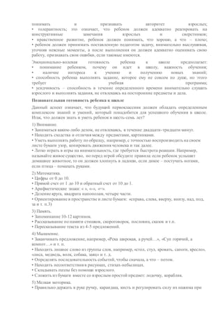 Документ содержит рекомендации для родителей по подготовке детей к школе, акцентируя внимание на необходимости комплексной подготовки, которая включает физиологический, психологический и познавательный аспекты. Он описывает важные навыки, которые должен развить ребенок, такие как внимание, математика, память, мышление и мелкая моторика. Также подчеркиваются важность домашних занятий, игровой формы обучения и сбалансированного подхода к нагрузке и отдыху.