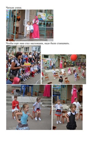 В документе описывается празднование дня рождения детского сада, к которому готовились совместно с родителями. Дети и сотрудники устраивали различные мероприятия, включая чтение стихов и танцы, а также сделали совместный торт. В итоге праздник завершился песней «Мы вместе», исполненной коллективом детского сада с участием детей.