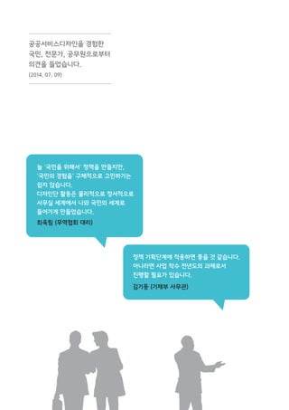 이런 변화가 일어나게 하기 위해 안행부, 산업부 외에도 민간 서비스디자인 전문가 여러분이 자발적으로 노력해주셨습니다.(김광순, 김민수, 민영삼, 염명수, 오영미, 유병철, 이경미, 이정규, 이종근, 이창호, 장종균)