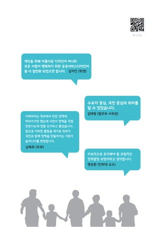 이 책은 공공정책, 서비스를 설계하고 운영하는 공무원들을 위한 서비스디자인 입문서입니다. 정부3.0을 추진하기 위해 서비스디자인을 어떻게 활용하면 좋을지를 소개하고 있습니다. 안전행정부 브랜드과제 발굴홍보단, 산업통상자원부 디자인생활산업과, 한국디자인진흥원 서비스디지털융합팀, 신사업개발팀, 민간기업 디맨드가 함께 만들었습니다.