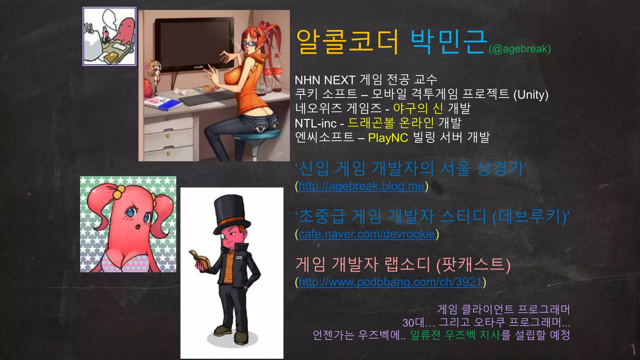 ps. Unity 2D 소개와 PlayMaker 소개에는 동영상이 포함되어 있는데, 아마 슬라이드셰어에서 재생은 되지 않을듯 합니다. 다운로드 받으시면, 동영상도 보실수 있습니다.