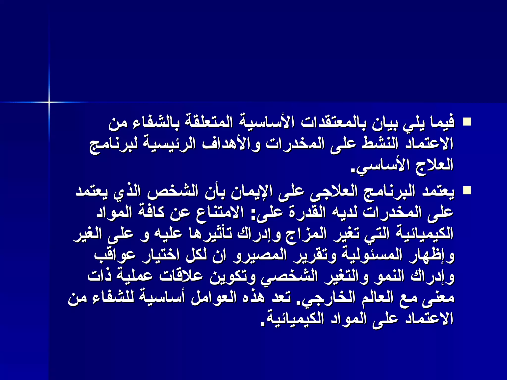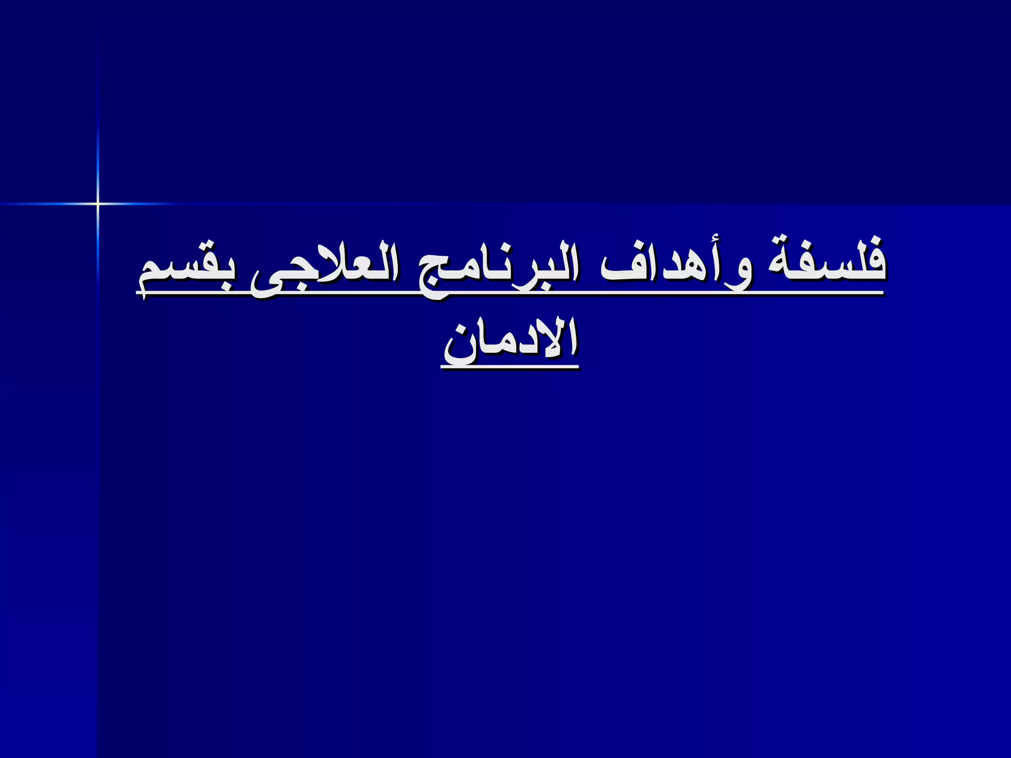 البرنامج العلاجي لقسم الإدمان يهدف إلى مساعدة الأفراد المدمنين على الامتناع عن المخدرات وتحقيق أسلوب حياة جديد يعتمد على المسؤولية والتغيير الشخصي. يشمل العلاج مراحل متعددة بدءًا من التعرف على المرض ووضع خطة علاجية فردية، إلى دعم الأسرة لفهم المرض والإدمان. المتابعة طويلة الأمد تعد جزءًا أساسيًا من التعافي لضمان الاستمرار في الامتناع عن المخدرات وتجنب الانتكاسات.