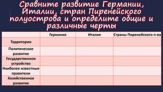 Документ охватывает политическое и экономическое развитие Германии, Италии, Испании и Португалии в позднем средневековье. Он описывает особенности раздробленности и торговых путей в Германии, развитие городов в Италии, а также объединение Арагону и Кастилии и завершение реконкисты в Испании. Основное внимание уделяется как политическому устройству, так и хозяйственной жизни этих регионов.
