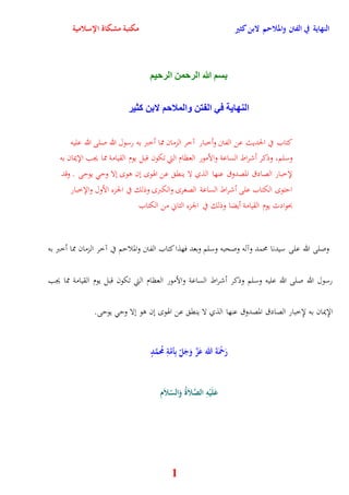 كتاب 'النهاية في الفتن والملاحم' لابن كثير يتحدث عن الفتن والأحداث المتعلقة بآخر الزمان كما أخبر بها رسول الله صلى الله عليه وسلم، بما في ذلك علامات الساعة وأمور هامة تحدث قبل يوم القيامة. يتناول الكتاب أيضًا تفاصيل الخلافة من بعد رسول الله والأحاديث النبوية المتعلقة بالفتن التي شهدتها الأمة الإسلامية بعد وفاته. بالإضافة إلى الإشارات النبوية حول أحداث تاريخية مستقبلة بما يشمل الفتوحات والمعارك التي ستخوضها الأمة.