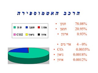השתנות הלחץ עםהעליה בגובה הלחץ נוצר עקב המשקל של האוויר , ומכוון שצפיפות האוויר משתנה ) האוויר הנו גז !), גוש אוויר שיוצר הפרש לחצים של 100 מ”ב , בגובה נמוך , יתפרס על נפח גדול יותר בגובה רב יותר , ולכן - h 1 < h 3 < h 2 1000 MB h 1 900 MB h 2 700 MB 800 MB h 3 ? מה הגובה שיש לעלות בכדי להוריד את הלחץ ב -100 מ”ב בין מפלסי לחץ שונים ?