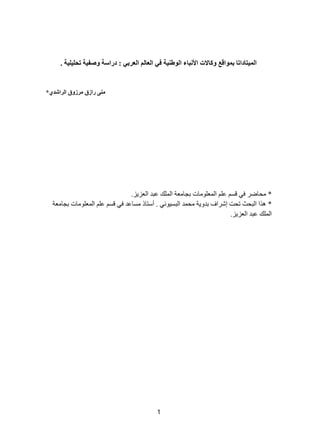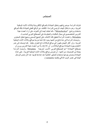 تتناول الدراسة تقييم وتحليل بيانات الميتاداتا على المواقع الإلكترونية لوكالات الأنباء العربية، حيث تسعى لإظهار مدى التزام هذه المواقع بالمعايير الدولية. تشير النتائج إلى نقص في جودة بيانات الميتاداتا واستخدام علامات وصفية غير صحيحة، مما يؤثر على استرجاع المعلومات عبر محركات البحث. وتوصي الدراسة بضرورة الالتزام بالمعايير الدولية لتحسين جودة البيانات.