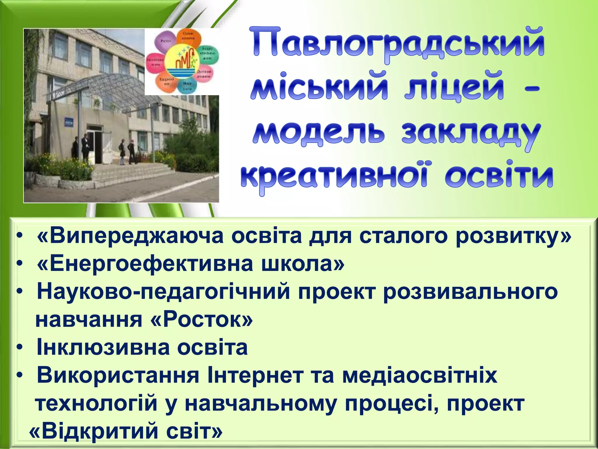 Павлоградський міський ліцей - модель закладу креативної освіту. Участь початкової школи в експериментальній діяльності ліцею, розвиток креативної особистості молодшого школяра