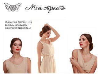 Документ представляет коллекцию косметики «моя страсть» от Bremani, включающую автоматические стойкие карандаши для глаз, туши для ресниц и помады с высоким содержанием натуральных ингредиентов. Продукты характеризуются уникальными свойствами, такими как самозатачивающийся механизм и гипоаллергенные формулы. В сезоне осень-зима 2014-2015 акцент делается на естественный макияж и яркие акценты для вечерних образов.