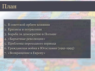 Документ охватывает историю Восточной Европы в XX веке, включая влияние СССР, демократические движения и переходные процессы после распада социалистического блока. Приведены примеры событий, таких как 'бархатные революции', гражданская война в Югославии и борьба за демократию в Польше. Основное внимание уделено последствиям политических изменений и вызовам, с которыми столкнулись страны региона на пути к демократизации и рыночной экономике.