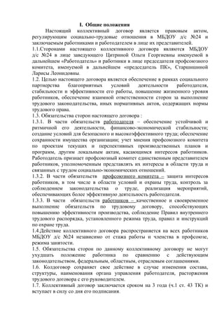 Настоящий коллективный договор регулирует социально-трудовые отношения между работниками и работодателем в мбдоу д/с no24, устанавливая обязательства сторон по обеспечению благоприятных условий труда и охраны прав работников. Договор включает положения о трудовых отношениях, режиме работы, оплате труда, охране труда и занятости, обеспечивая безопасность работников и защиту их интересов. Он вступает в силу с момента подписания и действует в течение трех лет, охватывая всех сотрудников независимо от их стажа и членства в профсоюзе.