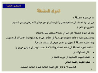 تتناول الوثيقة المواد المضافة إلى المنتجات الغذائية، والتي تُستخدم لأغراض متعددة مثل الحفظ، تحسين القيمة الغذائية، تحسين القوام والنكهة، وإضفاء الألوان. تُصنف المواد المضافة إلى عدة فئات كالمواد الحافظة، مضادات الأكسدة، المثخنات، المستحلبات، والمنكهات. بالرغم من فوائدها في تعزيز جودة الطعام، تثير المواد المضافة مخاوف تتعلق بالسلامة والصحة من استخدامها.