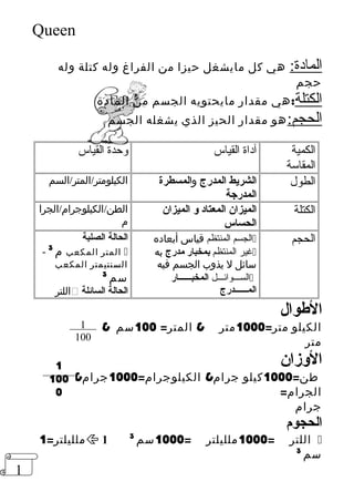 تتناول الوثيقة موضوع القياس بأنواعه، مع شرح للمادة والكتلة والحجم، والطرق المختلفة لقياسها باستخدام أدوات متنوعة مثل الميزان والمخبار. كما تتحدث عن حالات المادة المختلفة (صلبة، سائلة، غازية) وعناصر الطبيعة وخصائصها، موضحة التغيرات الفيزيائية والكيميائية. في النهاية، تناقش مكونات الكون مثل النجوم والكواكب وحركة الجرام السماوية.