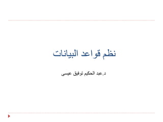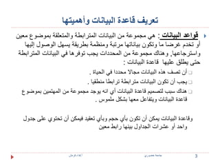 تعرف قواعد البيانات بأنها مجموعة من البيانات المترابطة والتي تسهل الوصول إليها، وتلعب دورًا حيويًا في مختلف المجالات مثل المصانع والشركات والمستشفيات. تشمل نظم قواعد البيانات أنواعًا متعددة حسب الاستخدام والتعقيد، وتتميز بفوائد عديدة تشمل تقليل التكرار في البيانات وتحسين الأمن والكفاءة. إدارة قواعد البيانات تتطلب مجموعة من العناصر البشرية والتقنية لضمان تصميمها وصيانتها بشكل فعال.