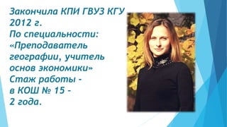 В документе представлена презентация опыта работы учителя географии Марии Владимировны Костючок, которая подчеркнула важность индивидуального подхода к каждому учащемуся. Она описывает использование кейс-технологии и различных методов обучения для развития критического мышления и самостоятельности у школьников. Также приведены примеры участия ученика в олимпиадах и конкурсах, а также планы на будущее по улучшению методов преподавания.