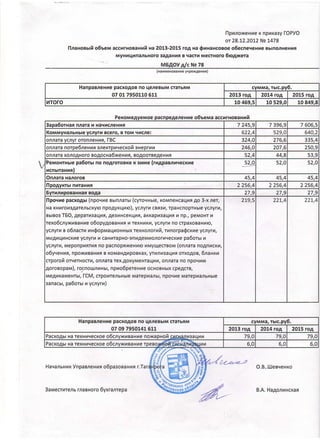 The document outlines a budget of 10469.5, 10529, and 10849.8 thousand rubles for the years 2013, 2014, and 2015 respectively to finance the fulfillment of a municipal task as part of the partial budget of a municipal body. The largest expenses are for wages and salaries at 7246, 7396.7, and 7606.5 thousand rubles for each year. The budget also allocates funds for utilities like electricity, water, and heating as well as products for food and other operational costs.