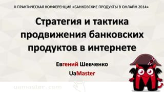 Документ описывает стратегию и тактику продвижения банковских продуктов в интернете на практической конференции, проводимой Евгением Шевченко, экспертом в интернет-рекламе. Основное внимание уделяется методам рекламирования банковских услуг с использованием различных инструментов, таких как контекстная реклама, SEO, социальные сети и веб-аналитика. Uamaster, как ведущая интернет-агентство, делится опытом и предлагает услуги по комплексному продвижению банковских продуктов.
