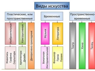 Документ описывает искусство как важную часть духовной культуры человека, подчеркивая его роль в выражении человеческих чувств и отношений к миру. Обсуждаются различные виды искусства, их взаимосвязи и языки, через которые они передают эмоциональные и эстетические идеи. Искусство рассматривается как инструмент для понимания времени и личности творца, требующий осознания категорий, таких как художественный образ, стиль и язык.