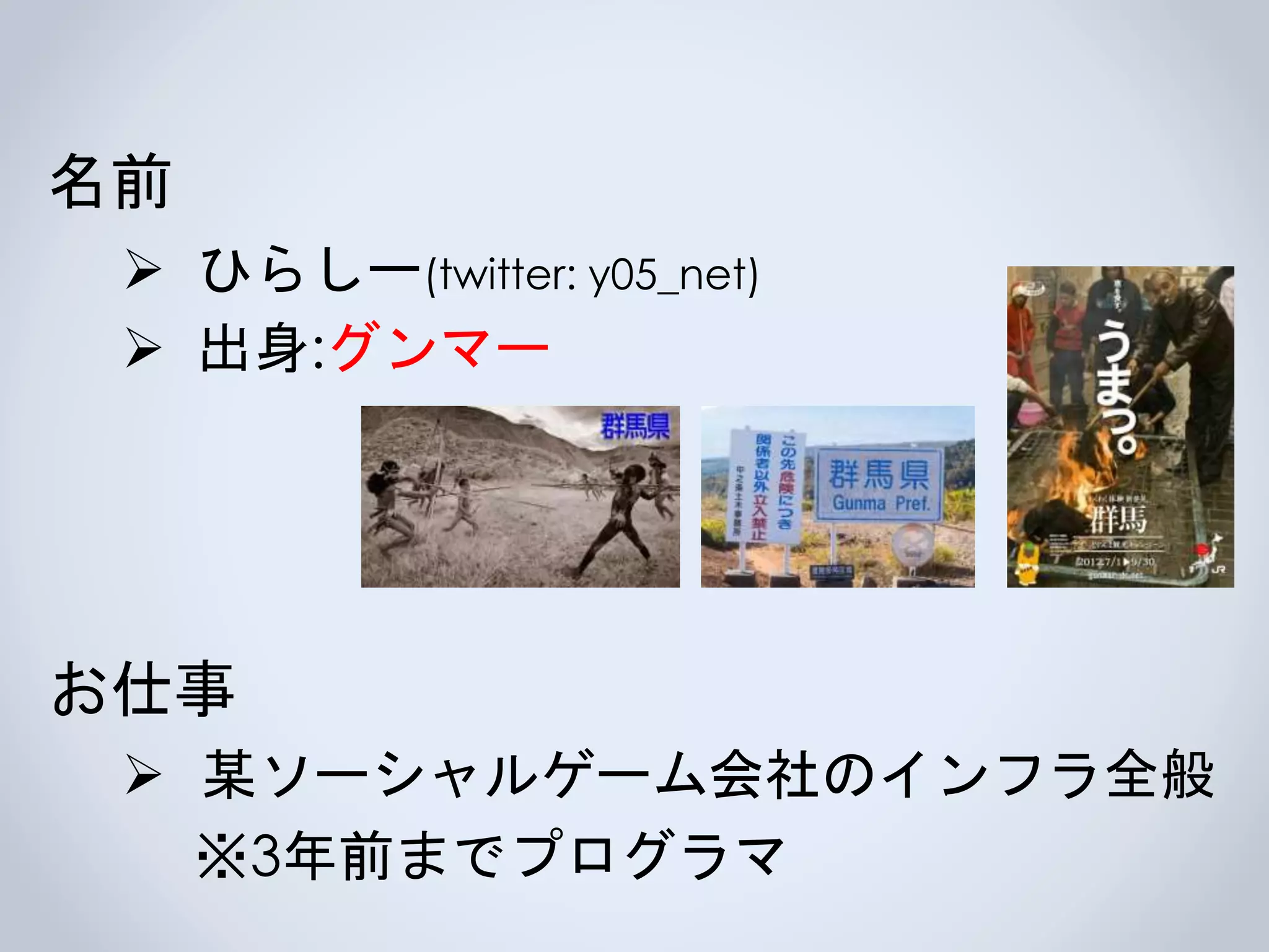 名前はひらしーと呼ばれています 出身は群馬です。まだ続々とコンテンツと成り立っている所がすごいですね 所属はソーシャルゲーム作っている会社のインフラエンジニアです 実は3年前までPHPやAndroidのプログラマでした